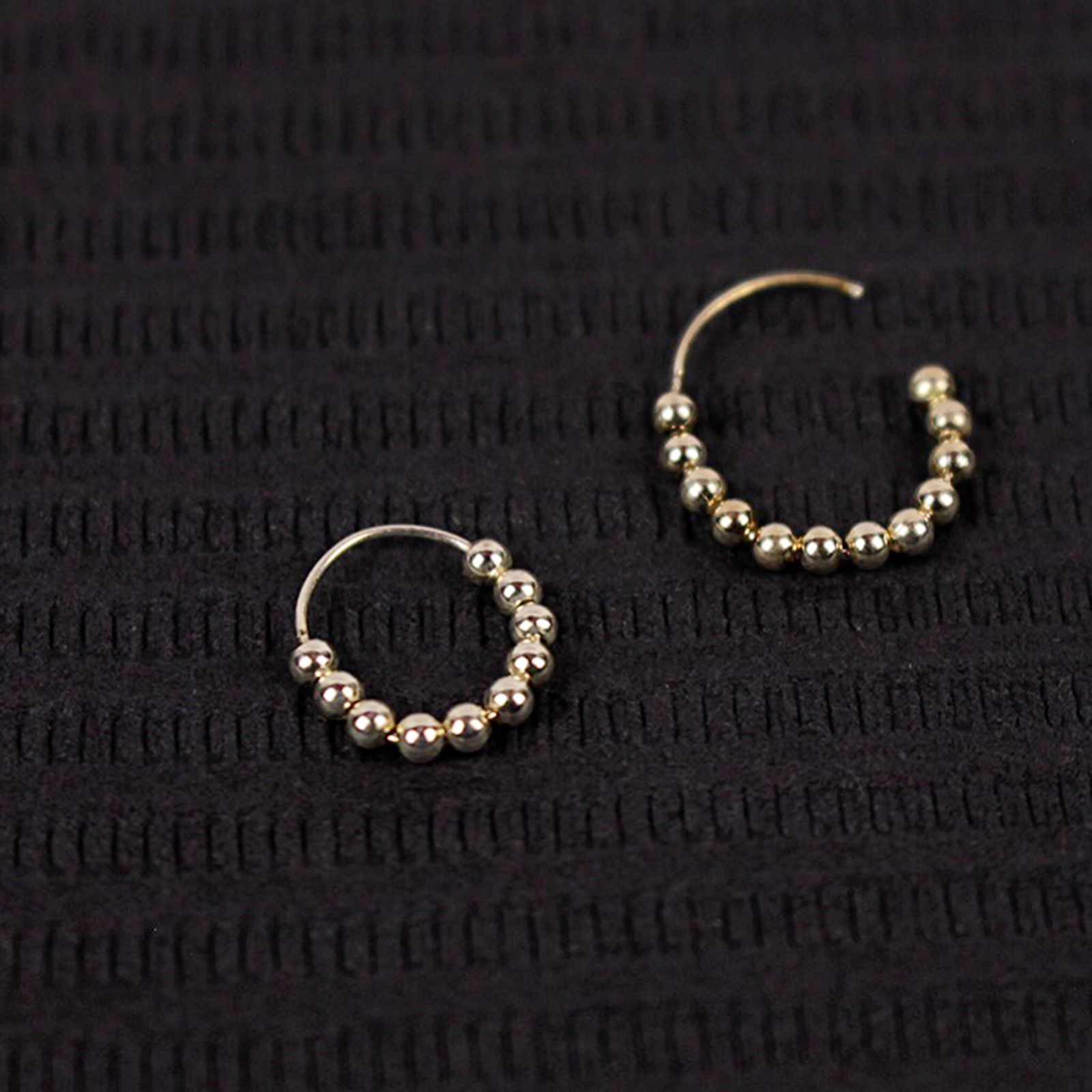Aros estilo Bali fabricados en plata de ley, con diseño clásico de bolitas que aporta brillo y textura. Su cierre práctico y estructura flexible permiten un uso cómodo y seguro tanto en orejas como en nariz.